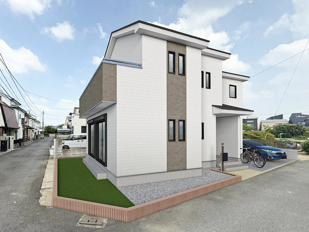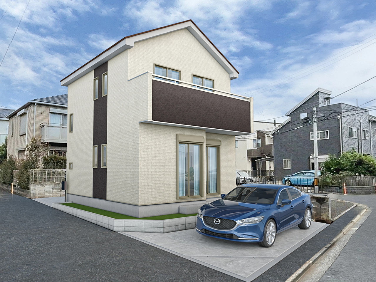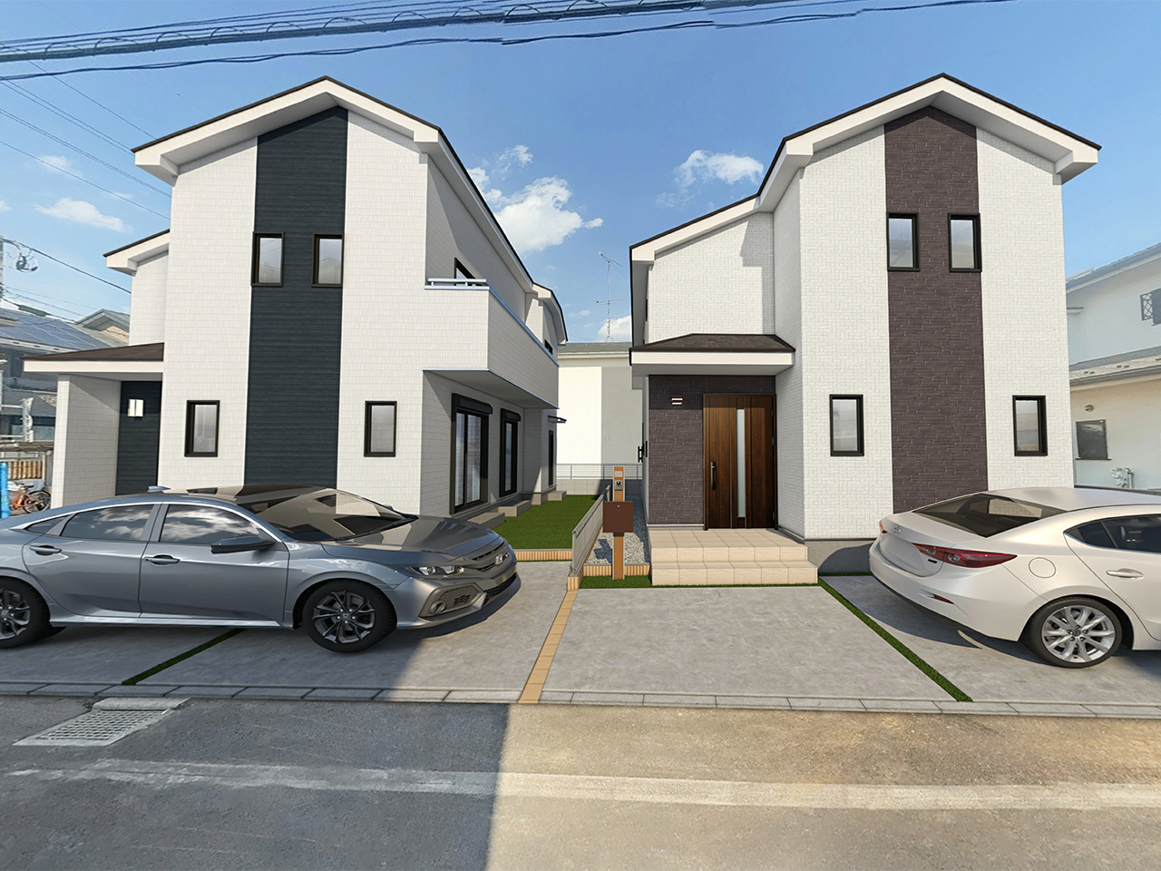 住宅新興事業協同組合で分譲した住宅の一部を、更地から完成後のイメージを持っていただくパースとしてご紹介いたします。敷地によってどのような家づくりや企画ができるのか、参考になれば幸いです。