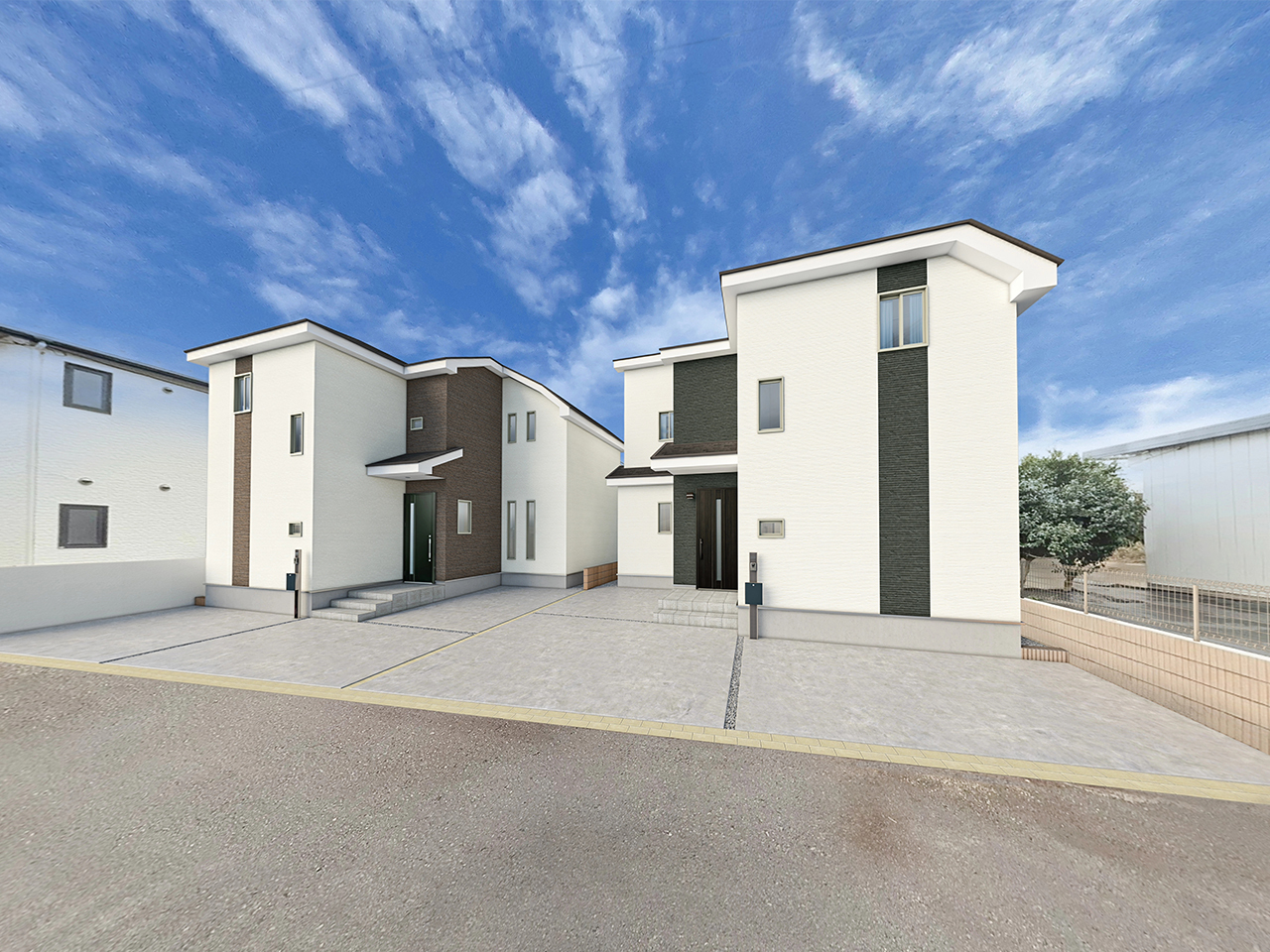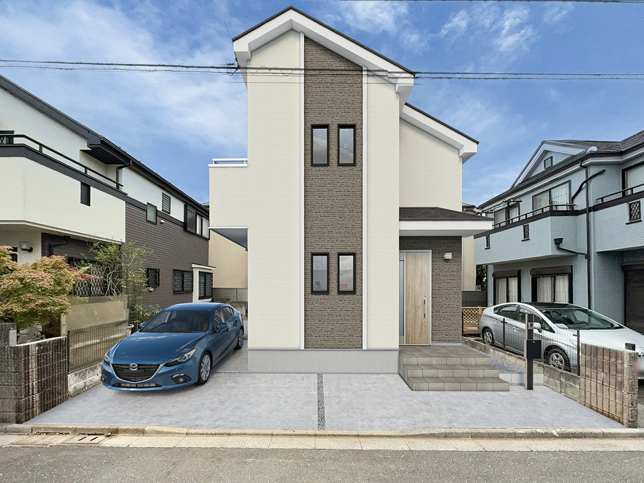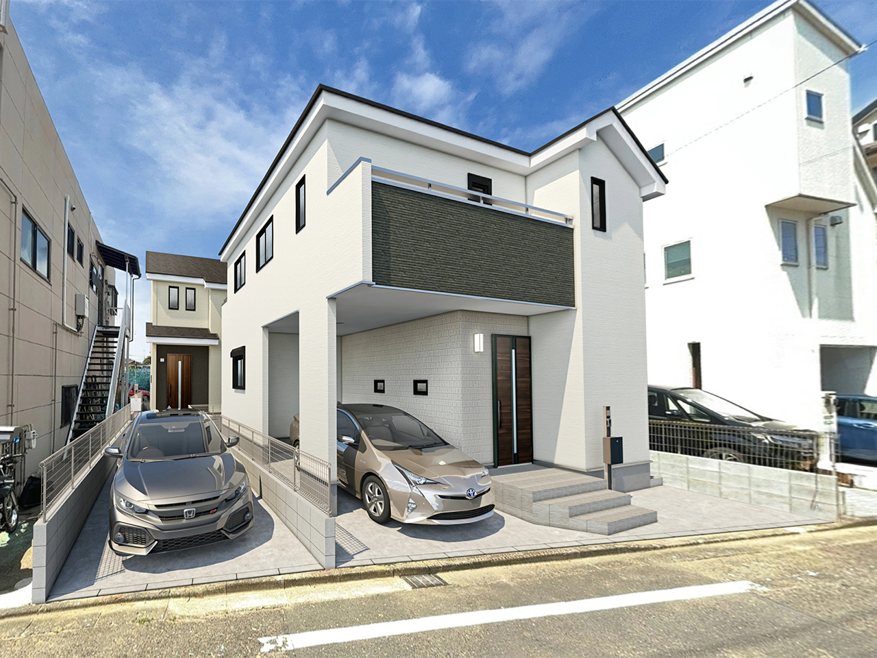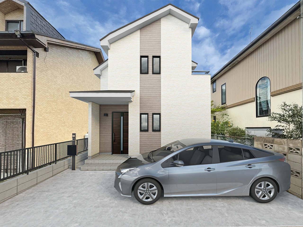 住宅新興事業協同組合で分譲した住宅の一部を、更地から完成後のイメージを持っていただくパースとしてご紹介いたします。敷地によってどのような家づくりや企画ができるのか、参考になれば幸いです。